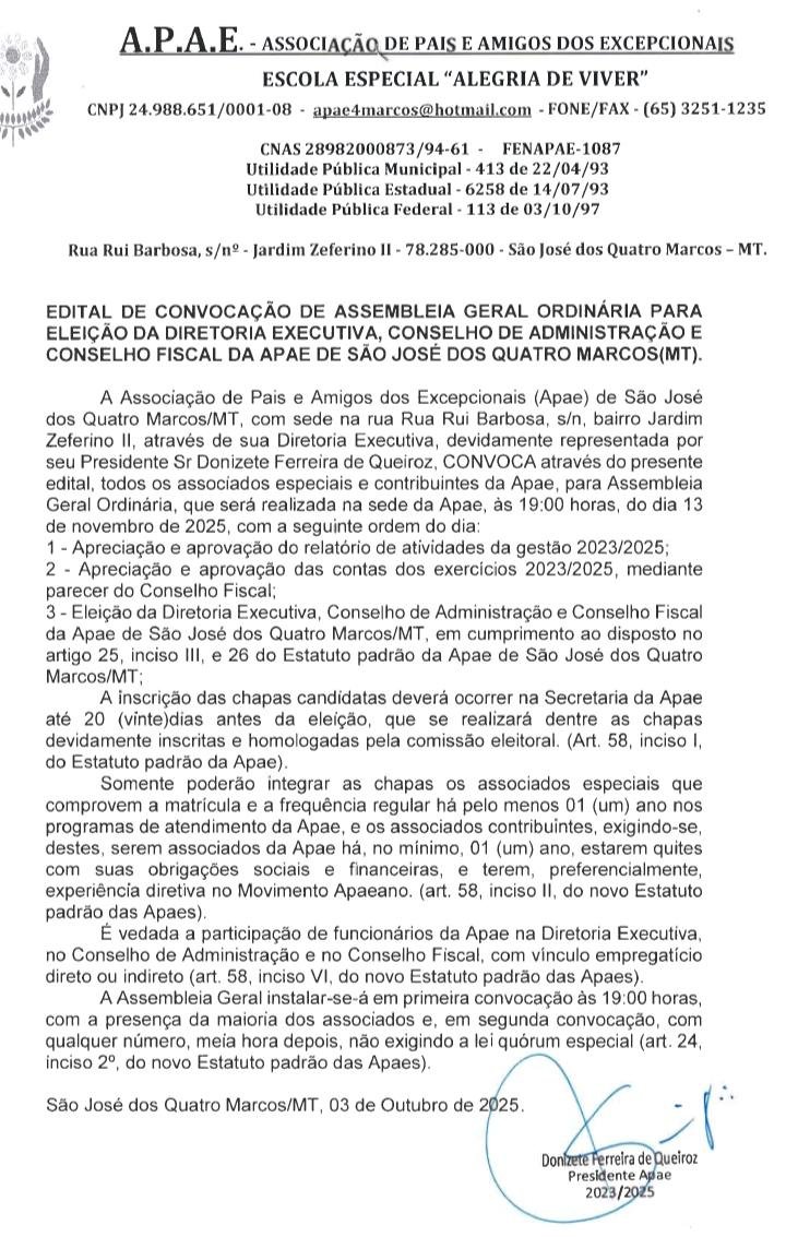 São José dos Quatro Marcos (MT) — A Associação de Pais e Amigos dos Excepcionais (APAE) de São José dos Quatro Marcos divulgou edital convocando todos os associados especiais e contribuintes para participarem da Assembleia Geral Ordinária, que será realizada no dia 13 de novembro de 2025, às 19h, na sede da instituição, localizada na Rua Rui Barbosa, s/nº, bairro Jardim Zeferino II.