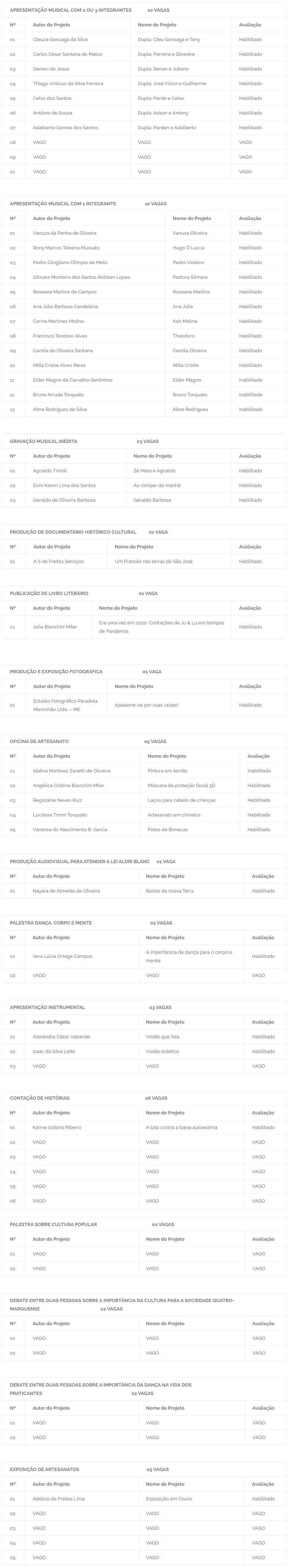 Como os demais projetos apresentados estavam documentalmente habilitados e ficaram em quantidade compatível com a quantidade de vagas disponíveis no edital, foram aprovados por aclamação dos conselheiros. Os recursos são oriundos do Governo Federal, através do Ministério do Turismo e Secretaria Especial de Cultura.