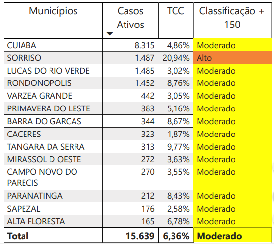 Ainda conforme a secretaria, diminuiu o número de cidades com risco “moderado” de contágio. Antes, eram 24. Agora, são 16. Entre os que permaneceram neste nível estão os municípios de Cuiabá, Lucas do Rio Verde, Rondonópolis, Várzea Grande, Primavera do Leste, Barra do Garças, Cáceres, Tangará da Serra, Mirassol D’Oeste, Campo Novo do Parecis, Paranatinga, Sapezal, Alta Floreta, Barra do Bugres e Nova Ubiratã. A cidade de Nova Nazaré também passou a ter risco moderado.