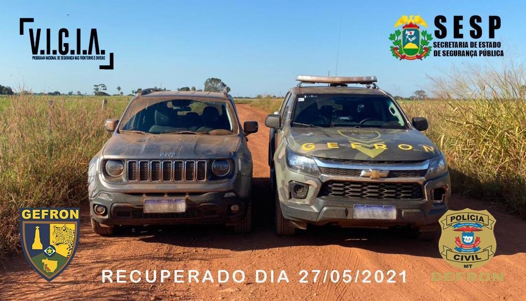 Já nesta quinta-feira (27.05), por volta de 12h, policiais do Gefron recuperaram um veículo, que possuía registro de apropriação indébita. Durante patrulhamento pela estrada vicinal do Laranjal, município de Porto Esperidião, a equipe policial visualizou um veículo Jeep Renegade de cor cinza, parado às margens da estrada.