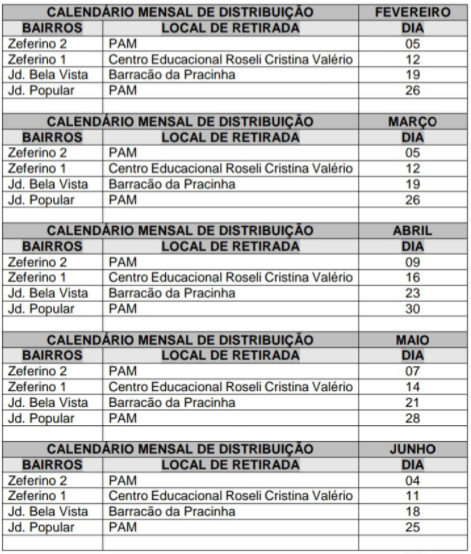 Divulgamos o Calendário Mensal de Distribuição às Famílias Beneficiárias Consumidoras do PAA.